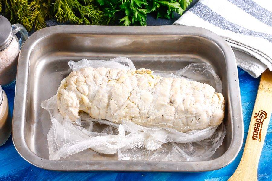 После этого извлеките рулет и выложите в другую емкость, остудите около 1 часа на холоде, чтобы блюдо тщательно охладилось. Можно использовать гнет.