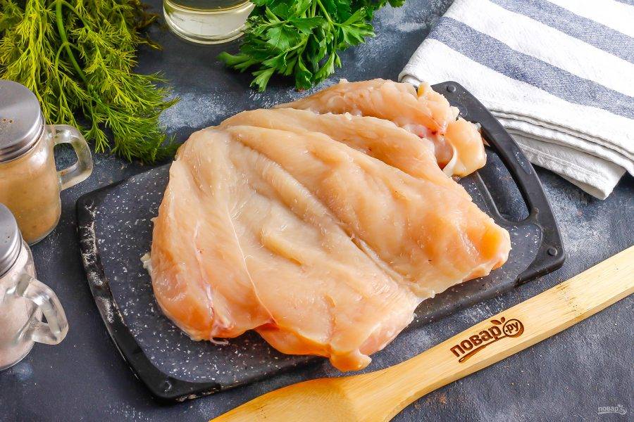 В то время филе промойте, срежьте с него жилы и пленки. Разрежьте пополам, но не до конца, раскрывая его как книжку.