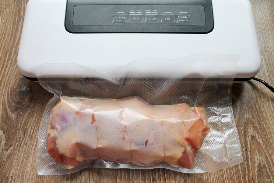 Выложите рулет в специальный пакет для вакуумных упаковщиков и завакуумируйте.