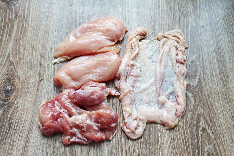 Курицу вымойте и обсушите. Разрежьте ее вдоль грудки или спинки и аккуратно снимите кожу, стараясь ее не повредить. Срежьте мясо с костей.