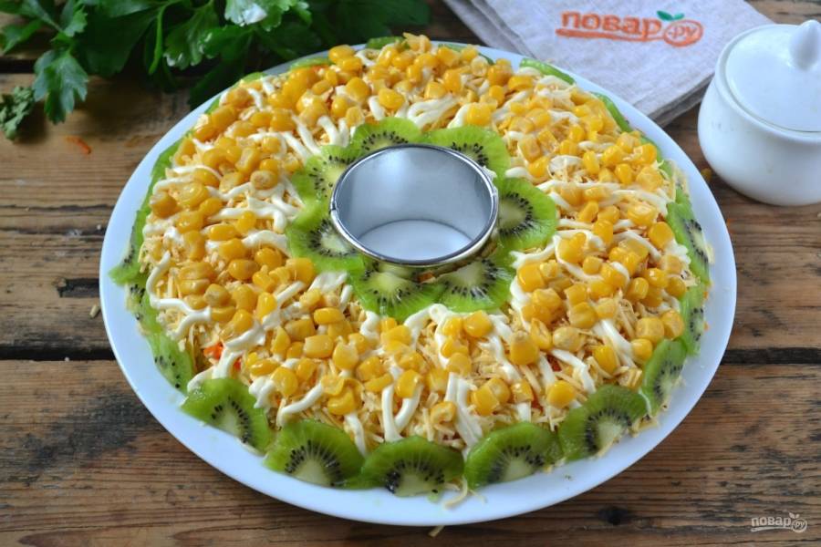 Сверху украсьте салат тонкими пластинами киви и кукурузой, как на фото. Получится очень нарядно и празднично. Кушайте с удовольствием!