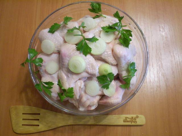 Любое куриное мясо получается вкусным на кефире. Но для большой компании лучше взять крылышки, чтобы всем хватило. Вымойте крылья и зелень, очистите лук. Количество лука — на ваше усмотрение. Я положила 5 луковиц, т.к. люблю жареный лук.