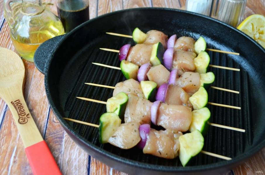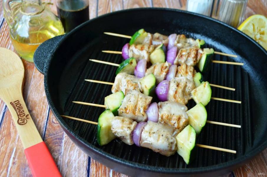 Хочу поделится с вами любимым рецептом, жареные на гриле шашлычки из курицы с луком и цуккини.Пожарить их можно не только на сковороде-гриль, но и на мангале или решетке над углями. Идея для пикника!