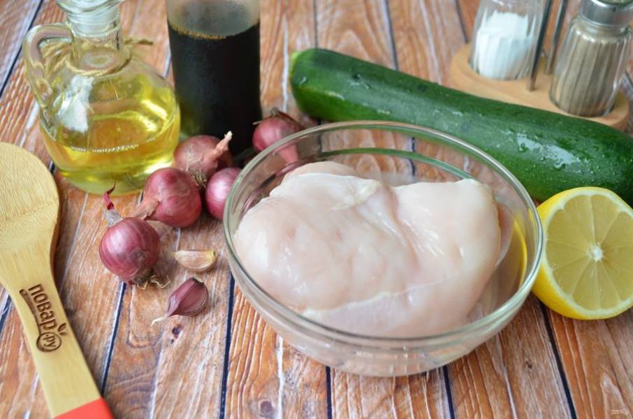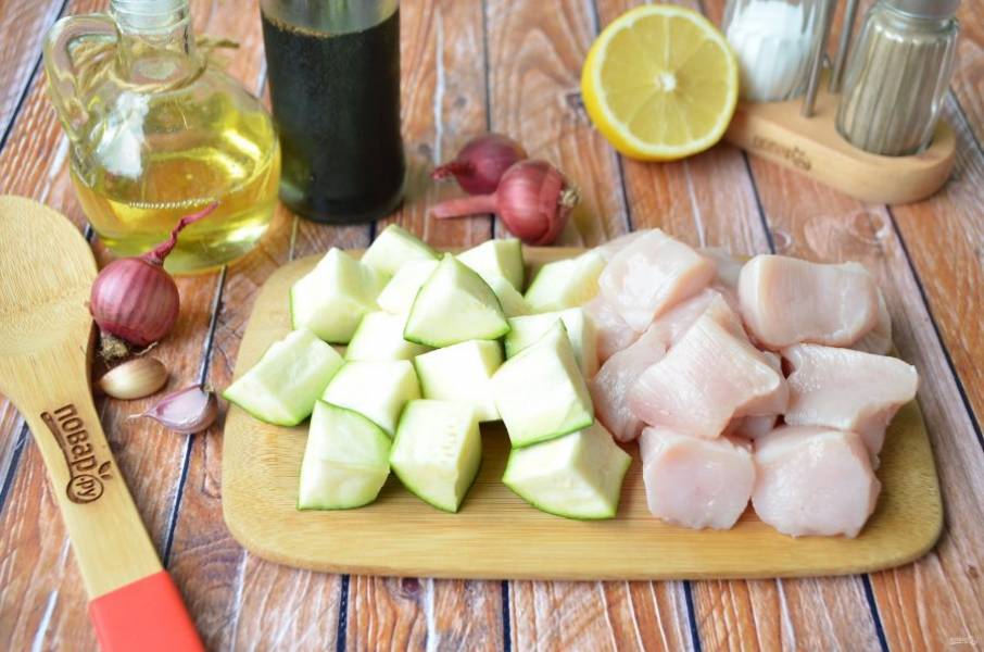 2. Порежьте куриное филе небольшими квадратными кусочками. Цукини вымойте, порежьте кусочками чуть меньшего размера. Если овощ очень тоненький, то порежьте просто шайбочками.