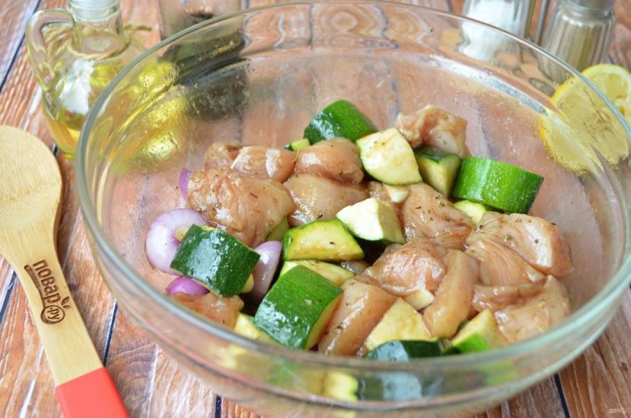 4. Шпажки бамбуковые для жарки замочите в холодной воде. Овощ и мясо положите в большую посудину, добавьте специи, если нужно, соль, соевый соус, масло растительное, лимонный сок свежевыжатый. Перемешайте. Затяните пищевой пленкой миску и оставьте на 2 часа.