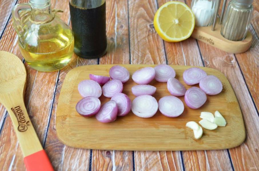 3. Очистите лук и чеснок. Каждую луковицу порежьте на две половинки поперек, чтобы он не рассыпался. Чеснок раздавите или порежьте на 3-4 части.