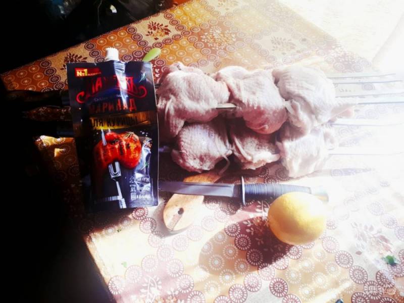 Куриные бедра вымыть, выдавить лимон, добавить немного лука, заправить маринадом от "Махеевъ" и дать промариноваться 1-2 часа. Мы выдержали час.
