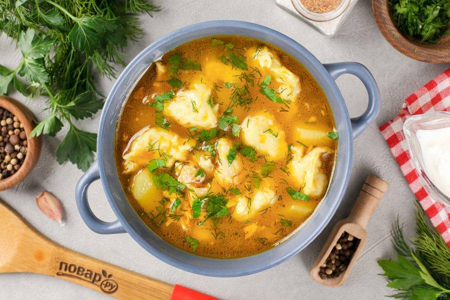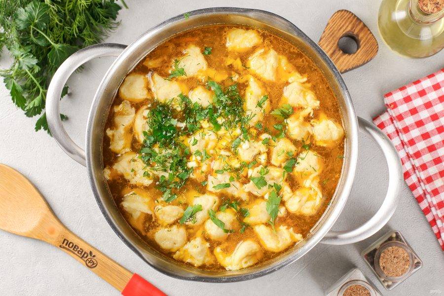 На этом же этапе добавьте измельчённый ножом чеснок и рубленую свежую зелень. Выключите огонь через пару минут, после того, как клёцки всплывут.
