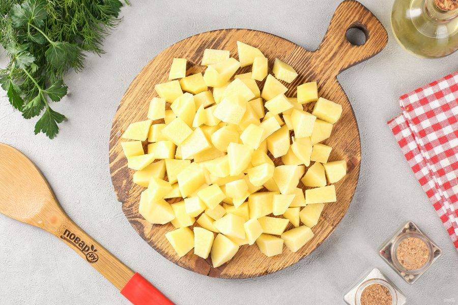 Поставьте кастрюлю на огонь. После закипания добавьте нарезанный кубиками картофель.