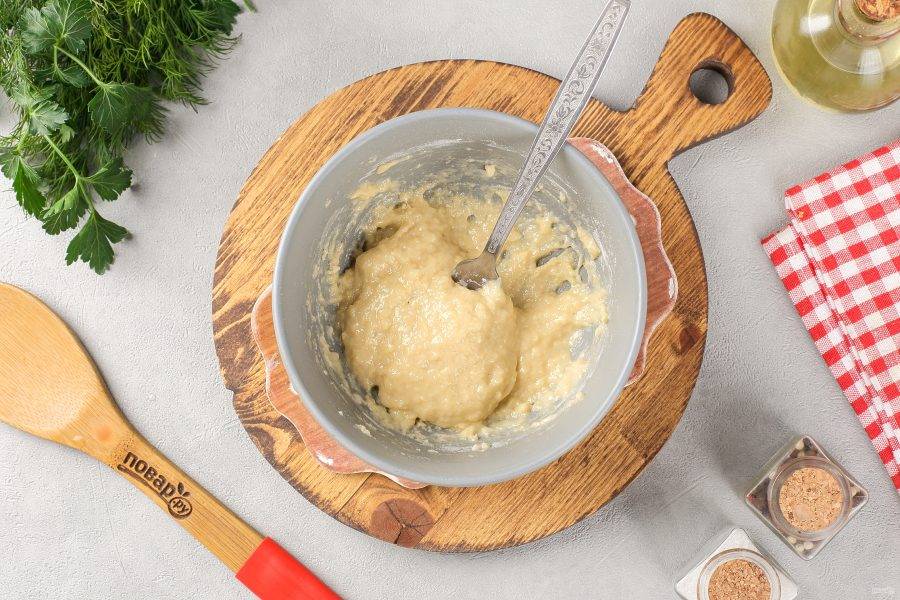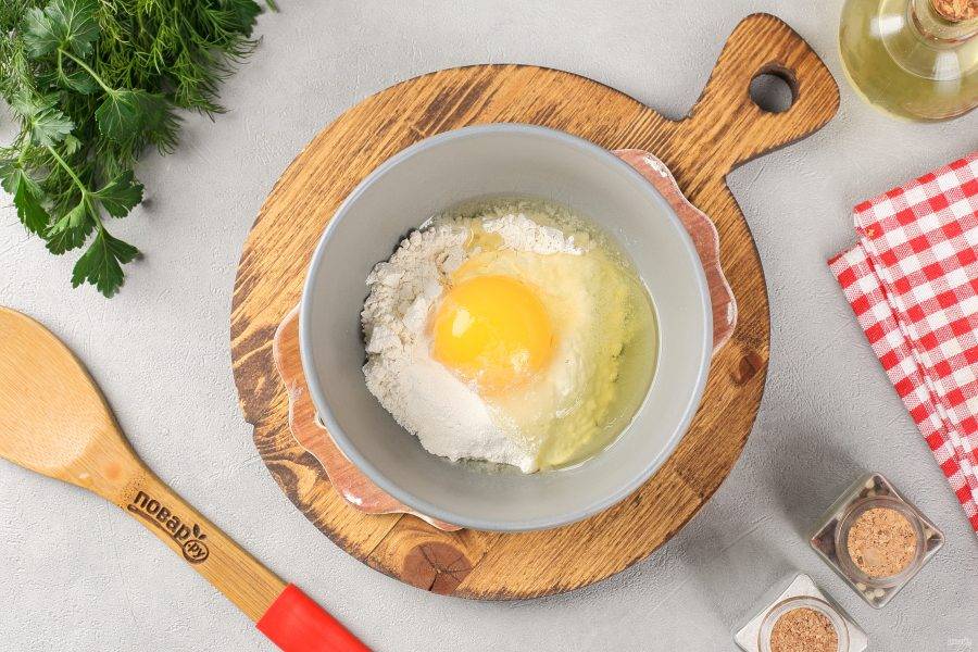 Параллельно подготовьте тесто для клёцок. Соедините муку и яйцо, добавьте соль по вкусу.