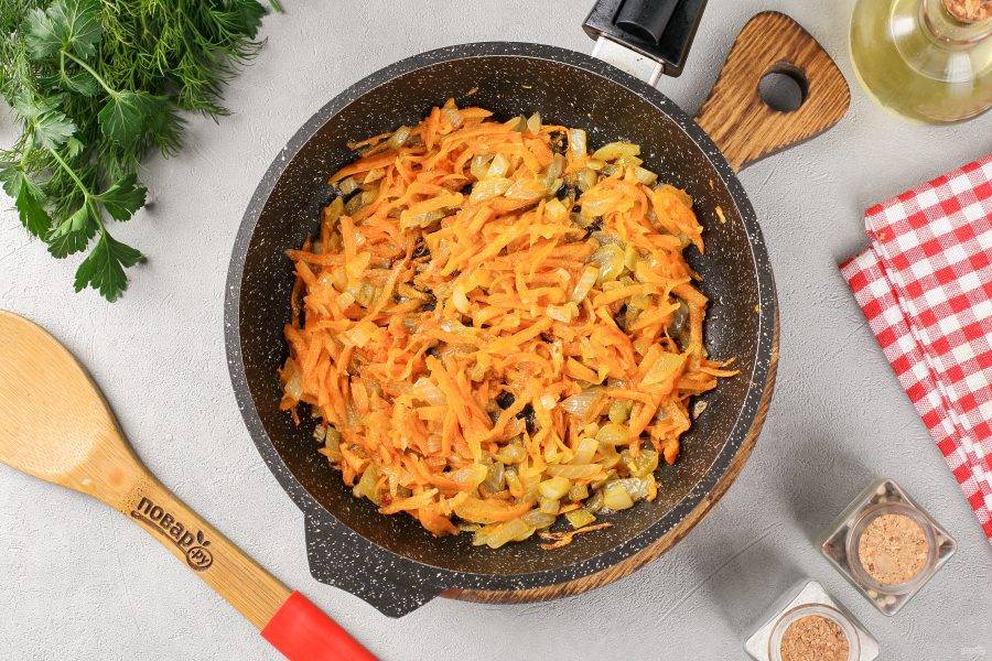 В сковороде обжарьте тёртую морковь и нарезанный кубиками лук. В процессе можете добавить любые специи по вкусу. Когда картофель будет почти готов, добавьте содержимое сковороды в кастрюлю.