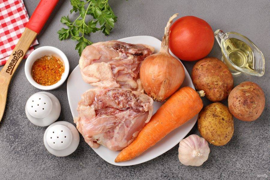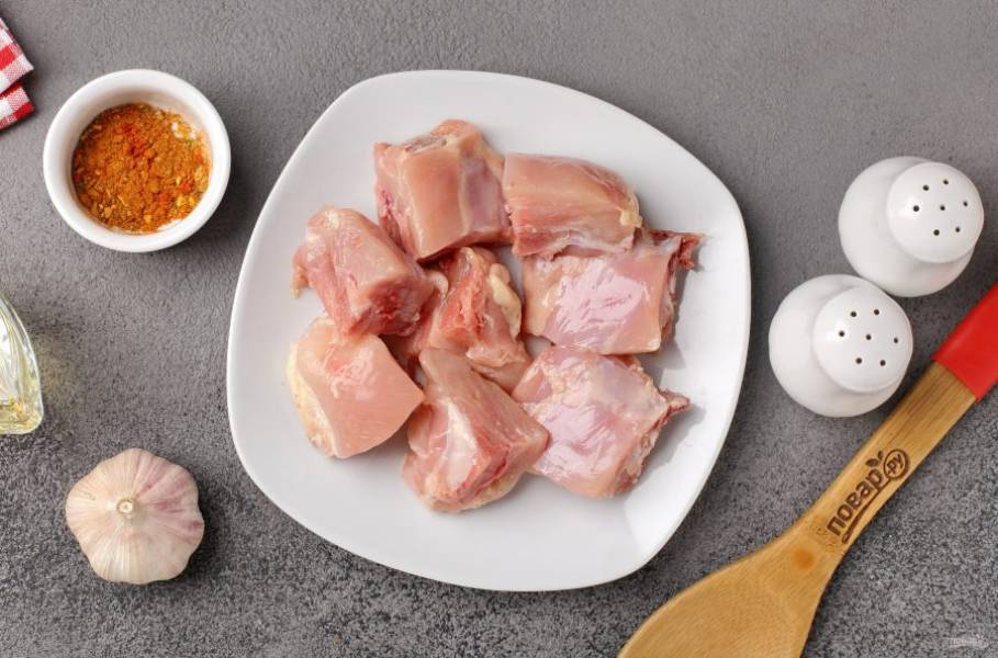 Курицу промойте, обсушите и нарежьте порционными кусочками.