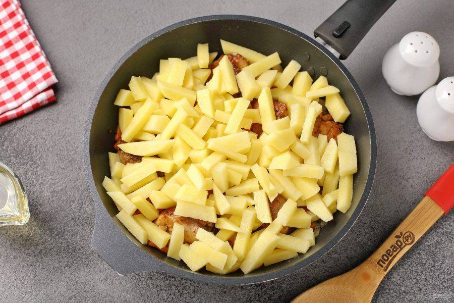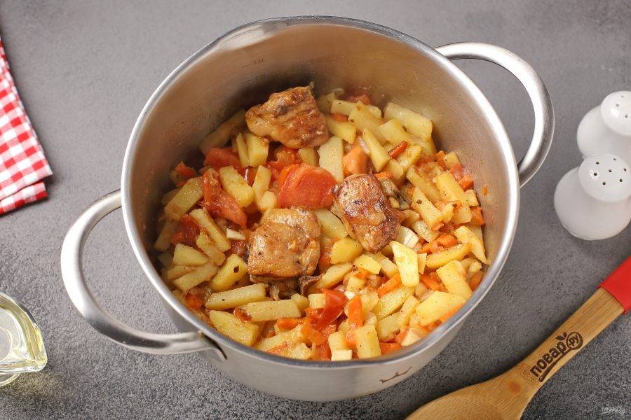 Обжарьте овощи с мясом в течение 5-7 минут.