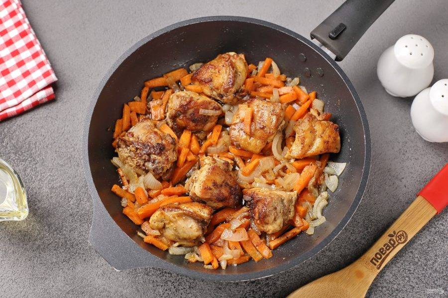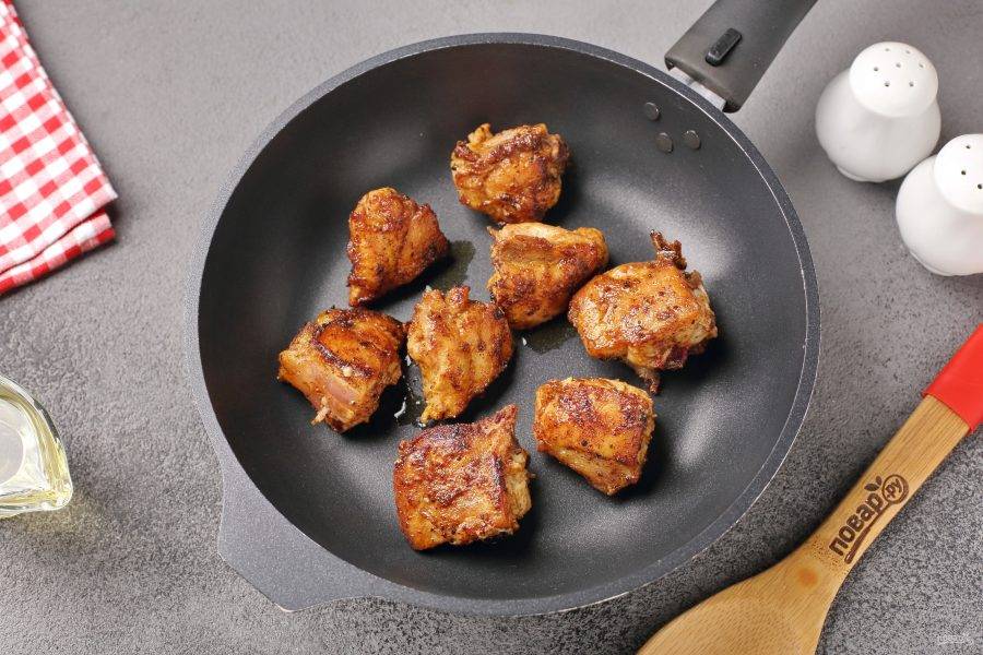 Натрите мясо солью и специями. Разогрейте в сковороде масло, выложите курицу и обжарьте на сильном огне со всех сторон до румяной корочки. Затем достаньте, сковороду вымойте, насухо вытрите и верните мясо обратно.