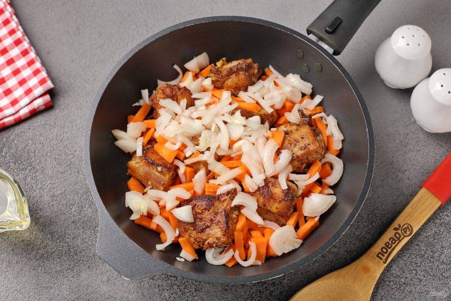 Добавьте 2-3 ст.л. растительного масла, нарезанные произвольно лук и морковь.
