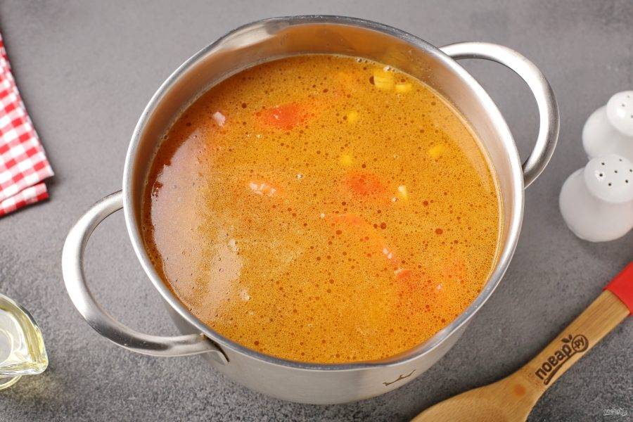 Добавьте кипяток (количество воды зависит от желаемой густоты супа) и соль по вкусу. Доведите до кипения и варите около 5-7 минут.