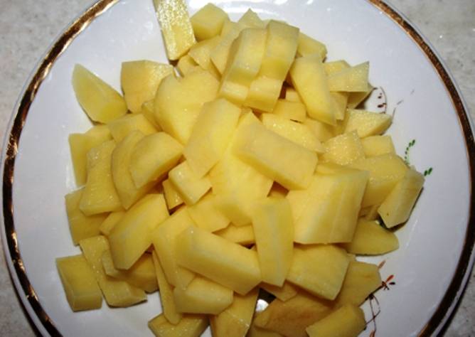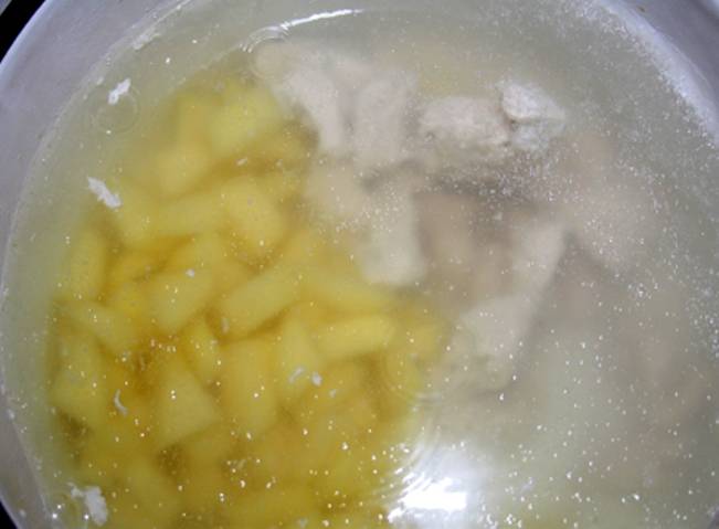Тем временем порежьте картофель, и как только бульон закипит, отправьте его в кастрюлю. Варите 20 минут.