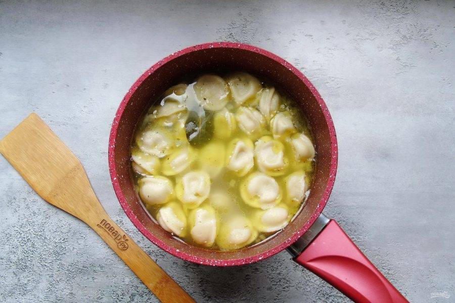 Когда овощи в супе будут доведены до полуготовности, выложите в кастрюлю пельмени и лавровый лист.