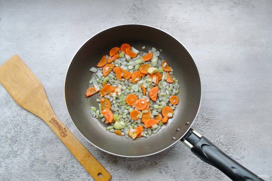 Лук и морковь мелко нарежьте, выложите в сковороду с подсолнечным маслом. Пассеруйте 7-8 минут.