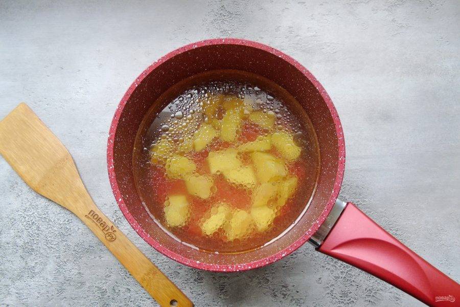 После курицу из бульона переложите на тарелку, а бульон процедите. Налейте в кастрюлю. Добавьте нарезанный кубиками картофель.