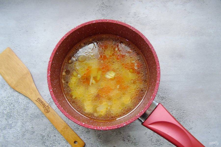 Добавьте лук с морковью в кастрюлю с бульоном и картофелем. Посолите и поперчите по вкусу.