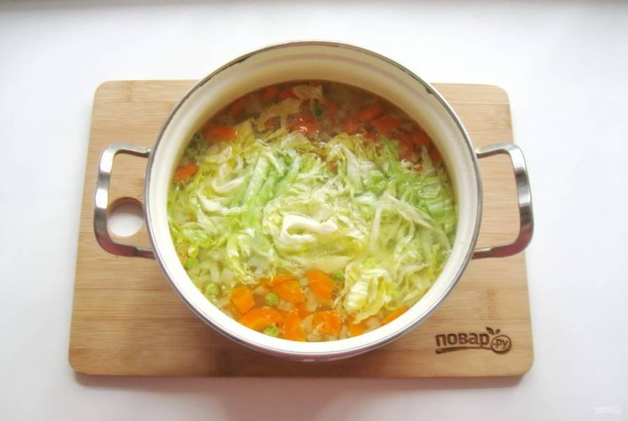 Когда все ингредиенты будут почти готовы, выложите в суп нарезанную молодую капусту. Посолите по вкусу. Варите суп еще 7-8 минут и выключайте.