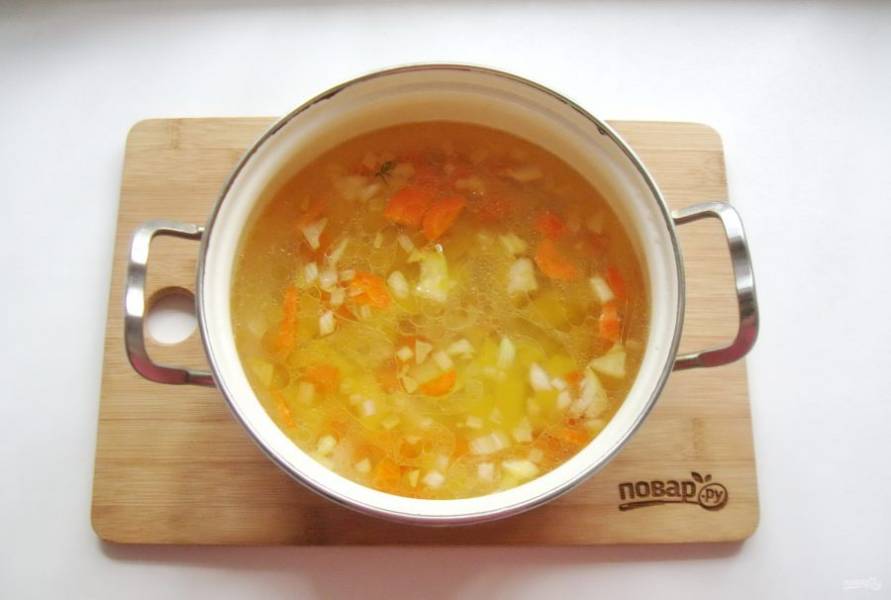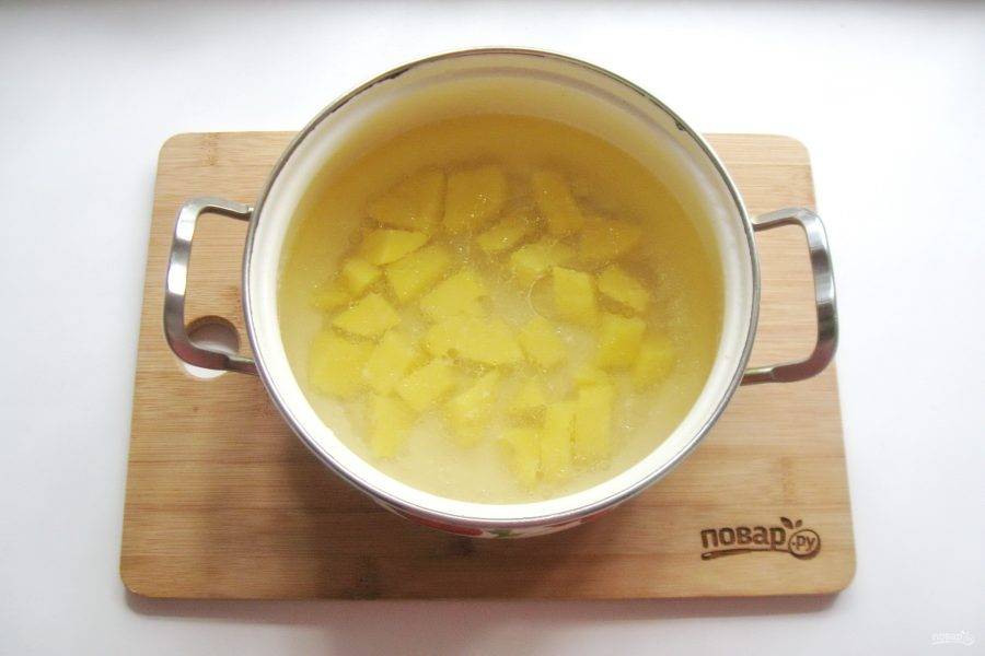 Процедите бульон и влейте в кастрюлю. Картофель нарежьте кубиками и выложите в кастрюлю. Начинайте варить суп.