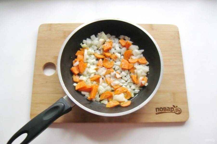 Морковь и лук нарежьте произвольно и выложите в сковороду. Налейте рафинированное подсолнечное масло и припустите овощи на небольшом огне в течение 8-10 минут.
