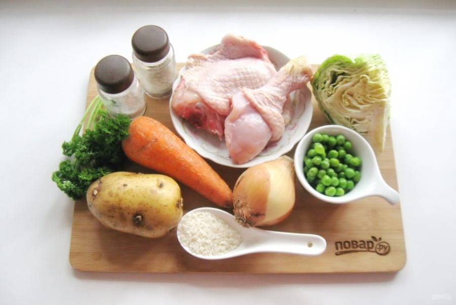 Подготовьте все ингредиенты для приготовления куриного супа с зеленью.