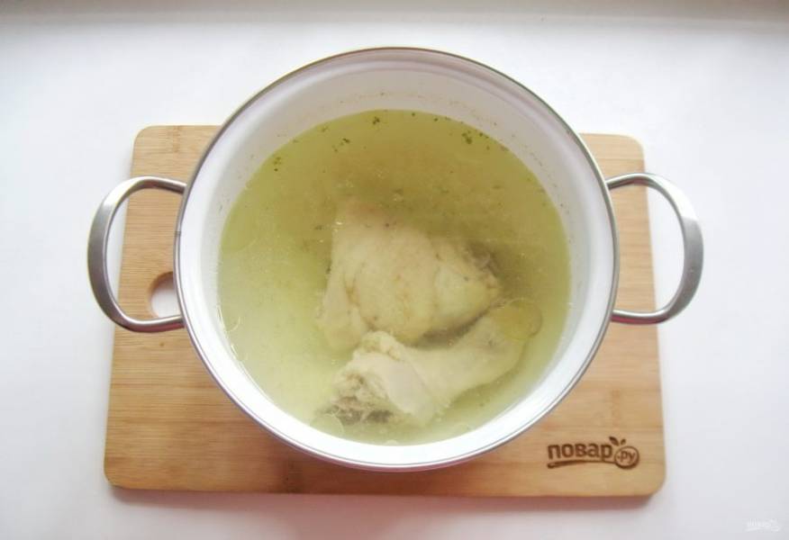Любые части курицы промойте и выложите в кастрюлю. Залейте свежей водой и поставьте на плиту. Доведите до кипения, снимите пену, огонь уменьшите и сварите бульон.