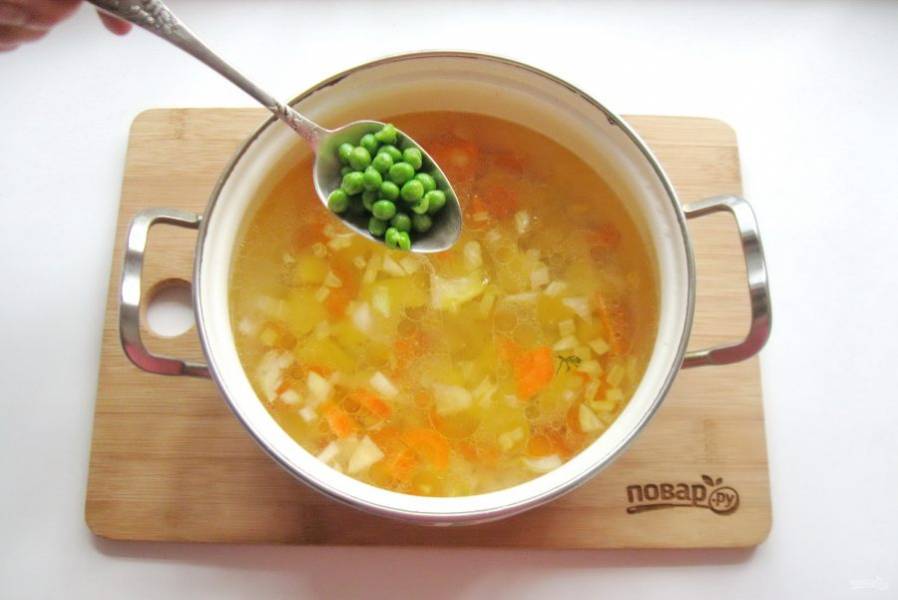 Всыпьте в кастрюлю свежий или мороженый зеленый горошек.