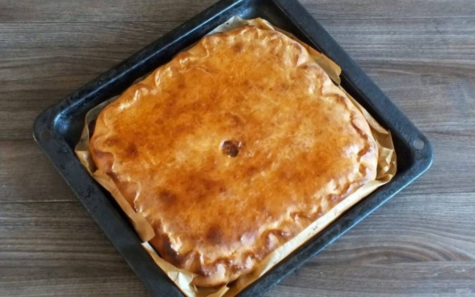 Готовый пирог достаньте из духовки. Смажьте кусочком сливочного масла, прикройте полотенцем и оставьте на 30 минут.