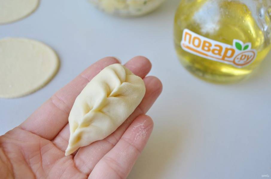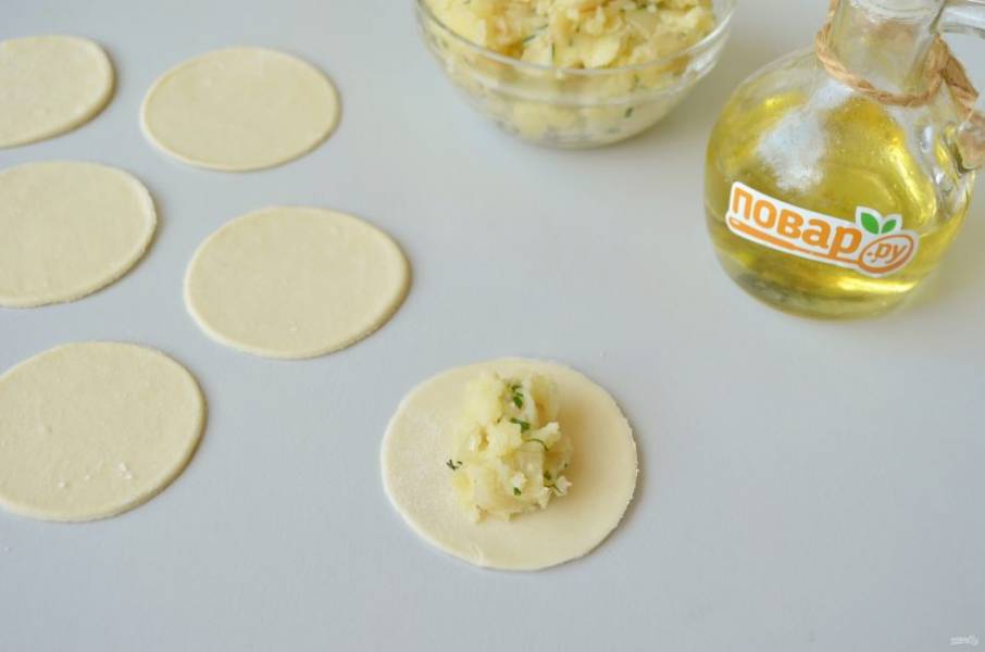10. Возьмите кружочек теста с картошкой в руки, так удобнее лепить. Заверните край теста на картошку, как на фото.
