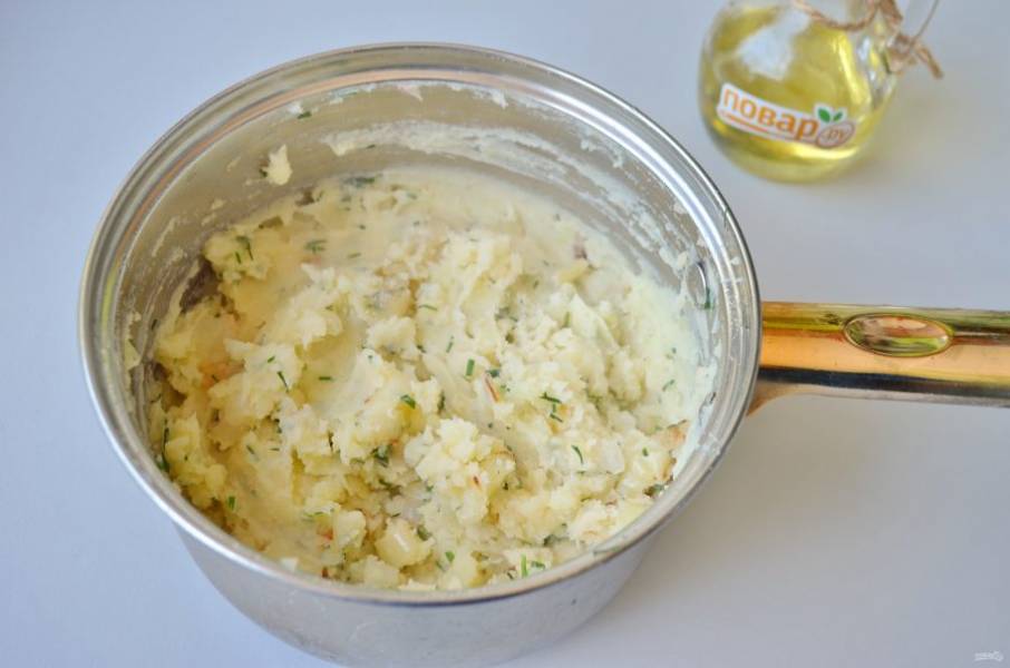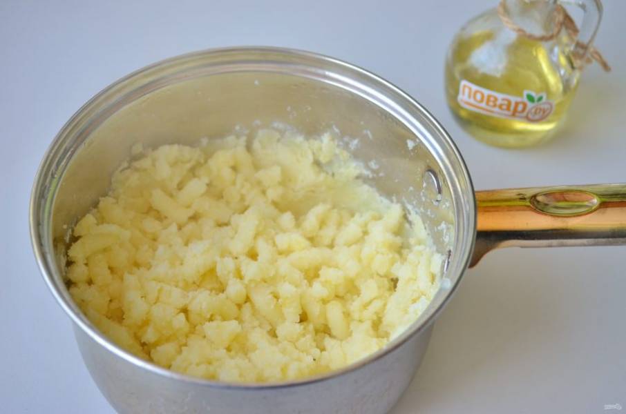 6. Из готового картофеля слейте весь отвар, толкушкой разомните картофель. Влейте 80 мл отвара. Перемешайте.
