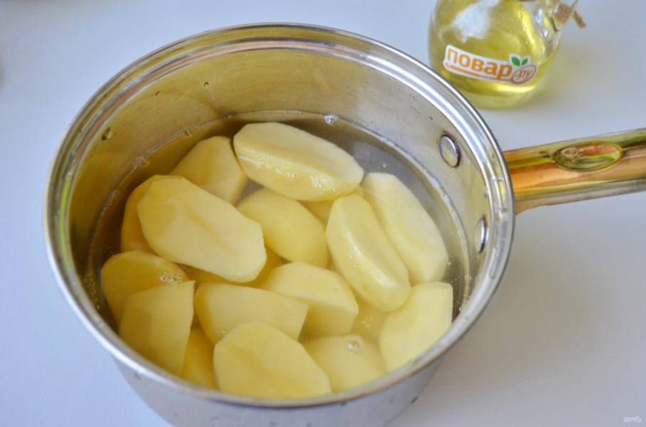 2. Очищенный картофель порежьте половинками или четвертинками, залейте водой, чтобы только покрыло картофель и поставьте вариться до готовности. Посолите по вкусу.
