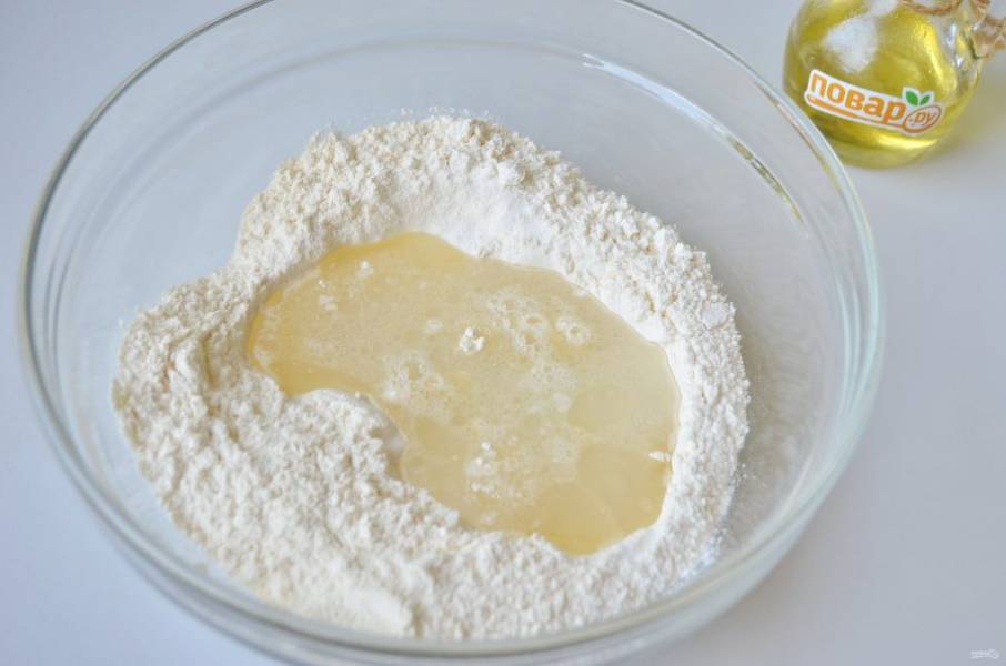 3. Просейте муку в большую миску, добавьте соль, перемешайте. Сделайте углубление в центре, влейте воду, масло и уксус. Начните замешивать тесто ложкой, далее переходите на стол.