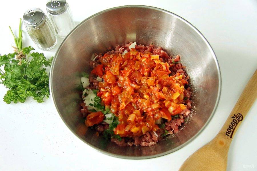 Добавьте нарезанные кубиками помидоры, предварительно ошпарив их и сняв шкурку, и нарезанный мелко чеснок.