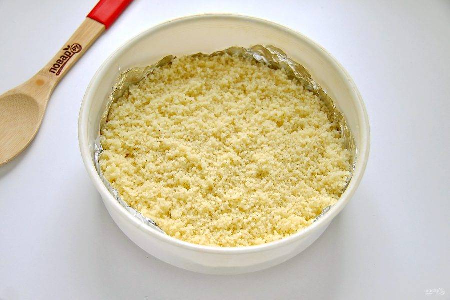 У меня нет специальной кускусницы, я использую обычный контейнер от пароварки. Застилаю дно фольгой и делаю множество мелких проколов зубочисткой по всему донышку для доступа пара. Так как в наших магазинах продается уже заранее пропаренная крупа, то приготовление на пару не отнимает много времени, по сравнению с традиционным не пропаренным кускусом. Поместите кускус в пароварку и готовьте 10 минут, после чего добавьте 1-2 ложки оливкового масла, соль и тщательно перетрите руками.