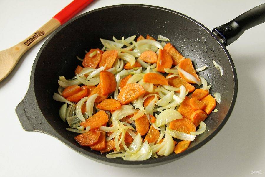 Все ингредиенты нарезаем произвольно, но стараемся не мельчить. Первым делом нарежьте лук и морковь и обжарьте до мягкости.