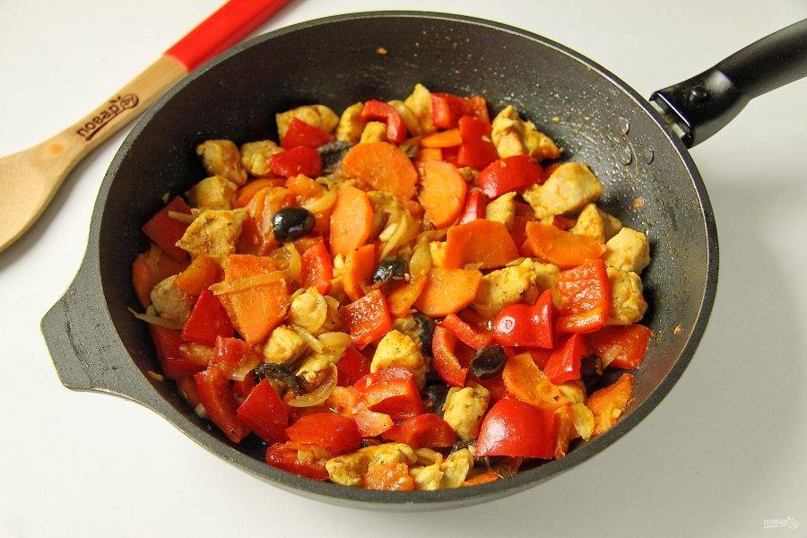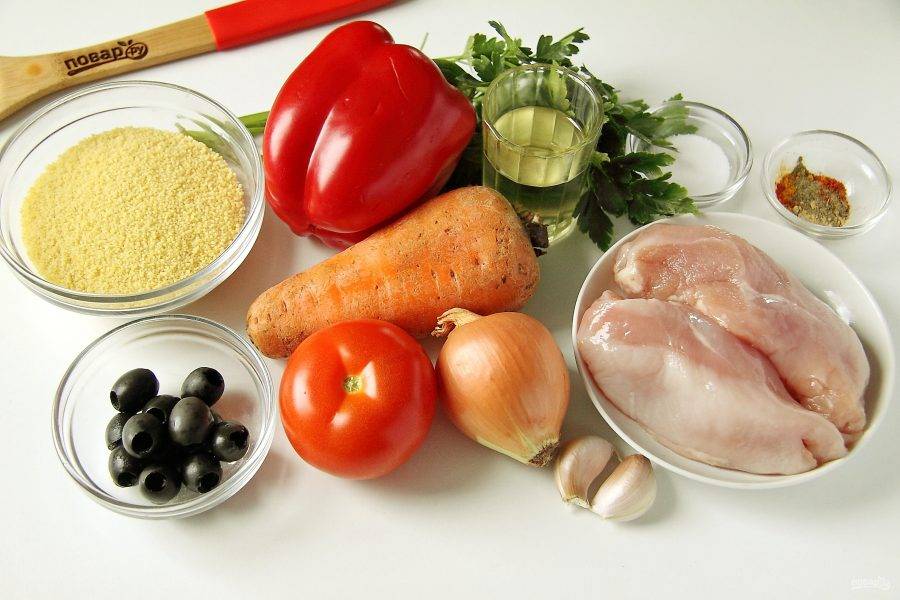 В конце добавьте помидор без шкурки нарезанный кубиками, измельченный ножом чеснок и нарезанные маслины. Через 5-7 минут можно убрать сковороду с плиты. Параллельно с приготовлением мяса с овощами приготовьте кускус. Кускус готовится очень легко, достаточно залить его кипятком согласно инструкции на упаковке и оставить на 5-10 минут или довести до готовности по правилам на пару.