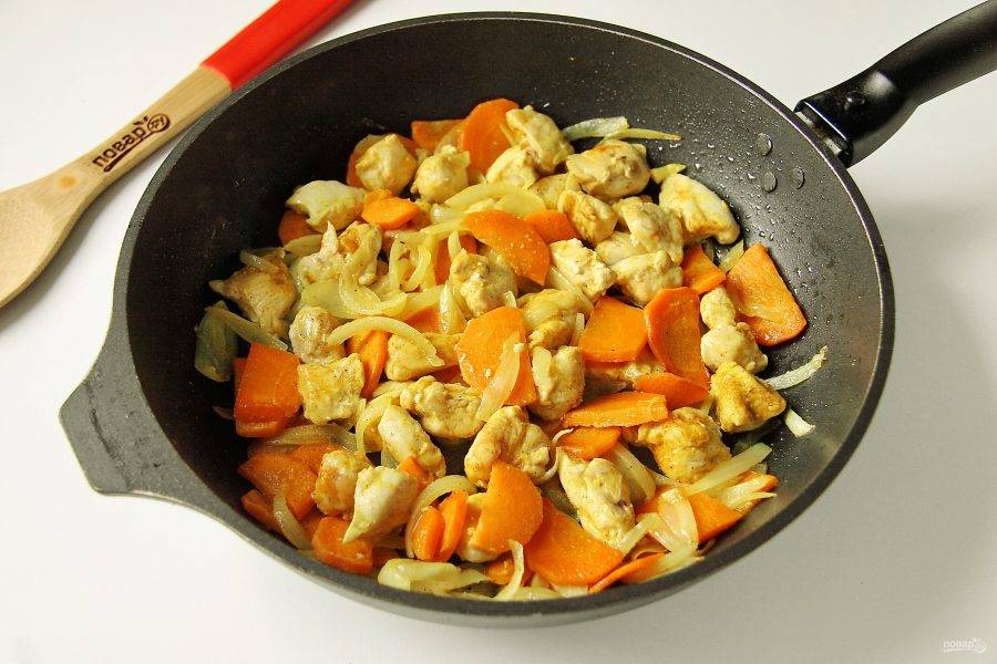 Обжарьте все вместе периодически помешивая до готовности мяса.