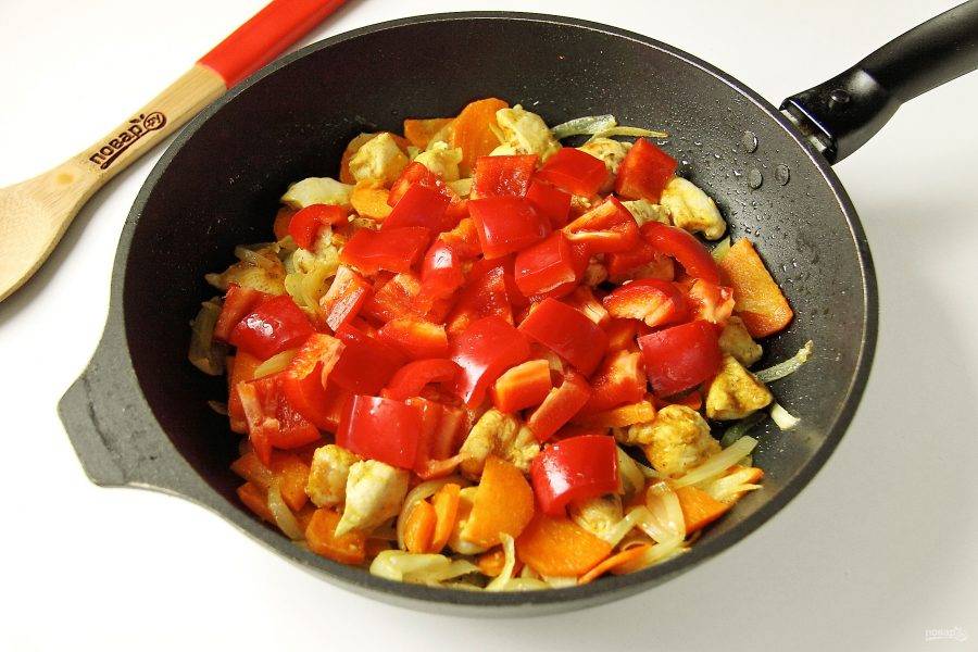 Добавьте нарезанный перец и продолжайте готовить еще 5 минут.