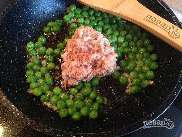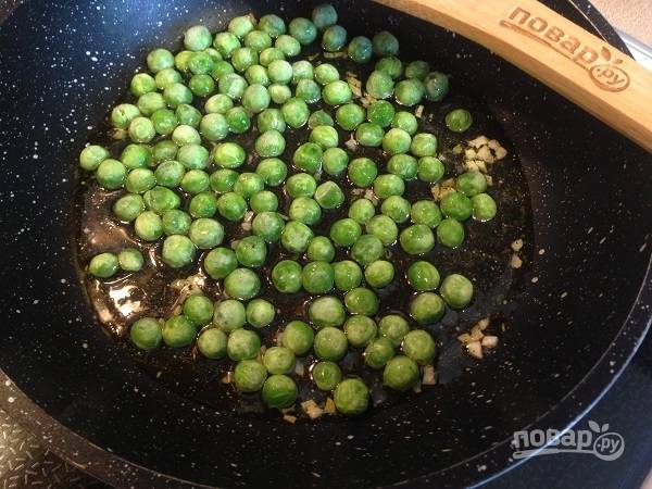 3. Добавим зеленый горошек (у меня замороженный), наливаем немного воды, накрываем крышкой и варим до готовности горошка. У меня горошек был готов через 10 минут. Открываем крышку и максимально выпариваем жидкость.