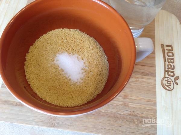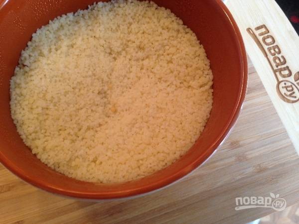 1. В первую очередь займемся кускусом. Высыпаем крупу в глубокую чашку, добавим соль и заливаем кипятком. Накрываем тарелкой и оставляем минут на 10-15.