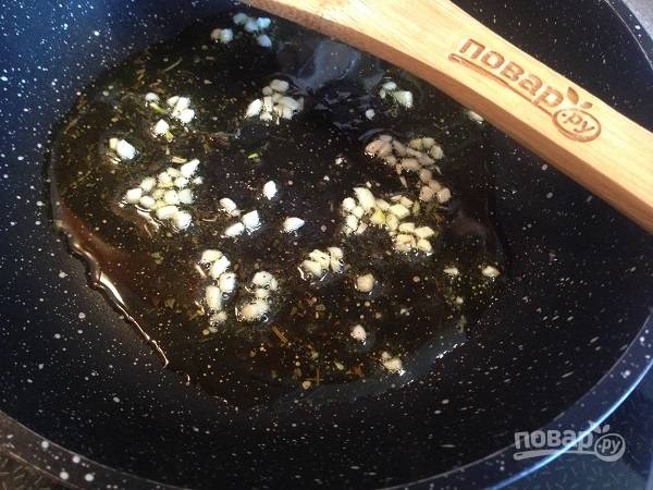 2. А пока очистим и мелко нарежем чеснок. Обжариваем его на разогретом оливковом масле вместе с сушеным базиликом примерно минуту-полторы.