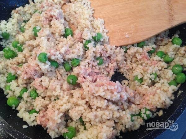 4. Добавляем тунец, предварительно сцедив сок. Размешиваем и прогреваем минуту-полторы.