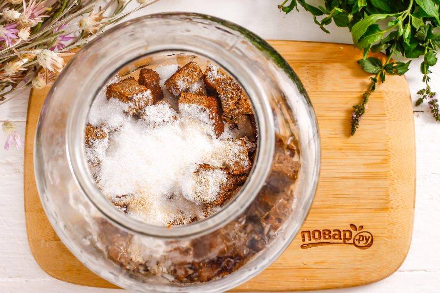 Сухарики остудите и всыпьте в банку или кастрюлю, в которой будете готовить квас. Добавьте туда же сахар.
