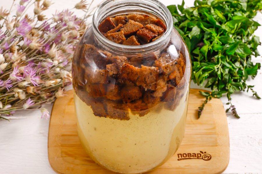 Поместите емкость в другую емкость — более глубокую, чтобы при газировании жидкость не вылилась на стол. Оставьте квас созревать сутки при комнатной температуре.