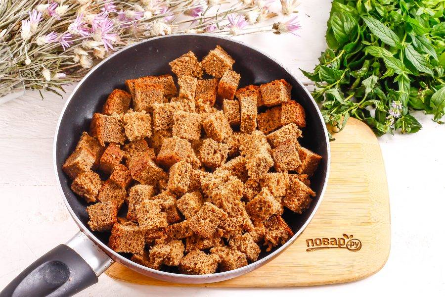 Хлебные ломтики нарежьте кубиками и обжарьте на сковороде до румяности без добавления масла. Лучше их слегка зажарить — они подарят напитку свой цвет и вкус.