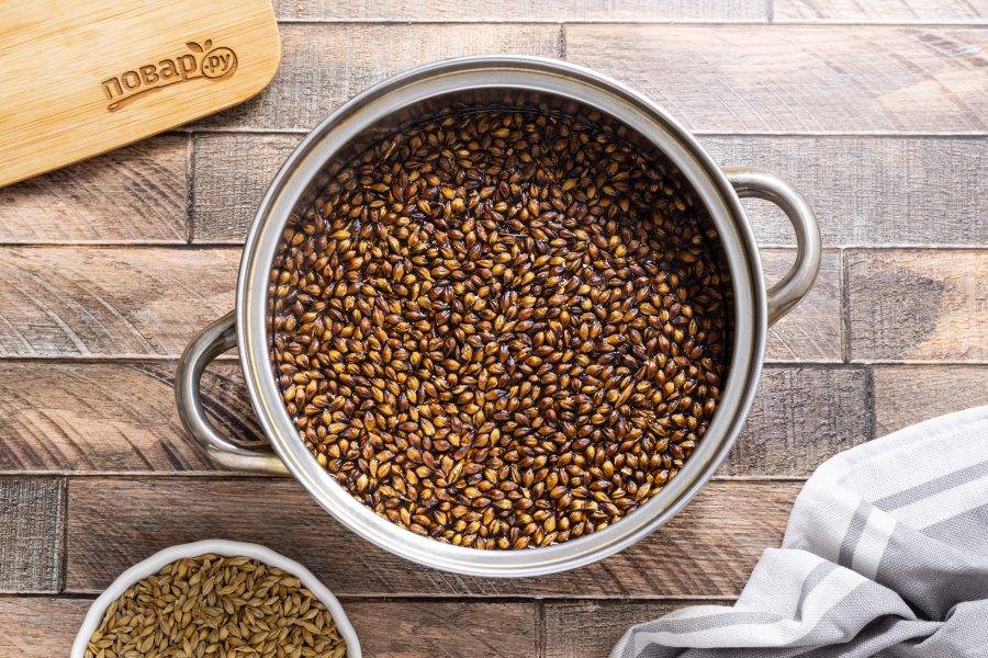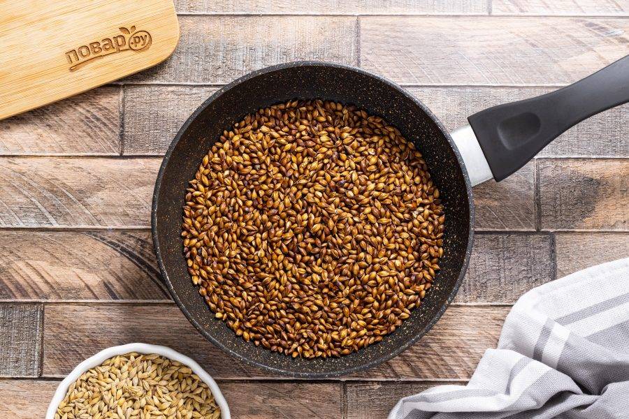 На среднем огне обжарьте ячмень до румяного коричневого цвета. Следите, чтобы он не подгорел, постоянно помешивайте.